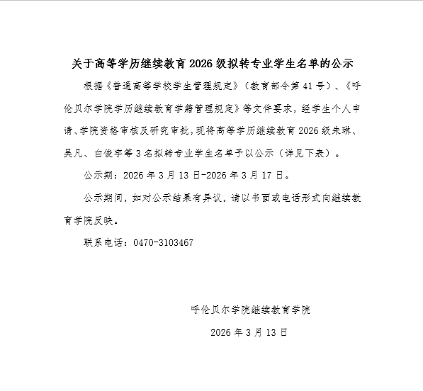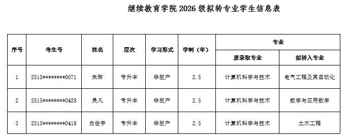 关于高等学历继续教育2026级拟转专业学生名单的公示