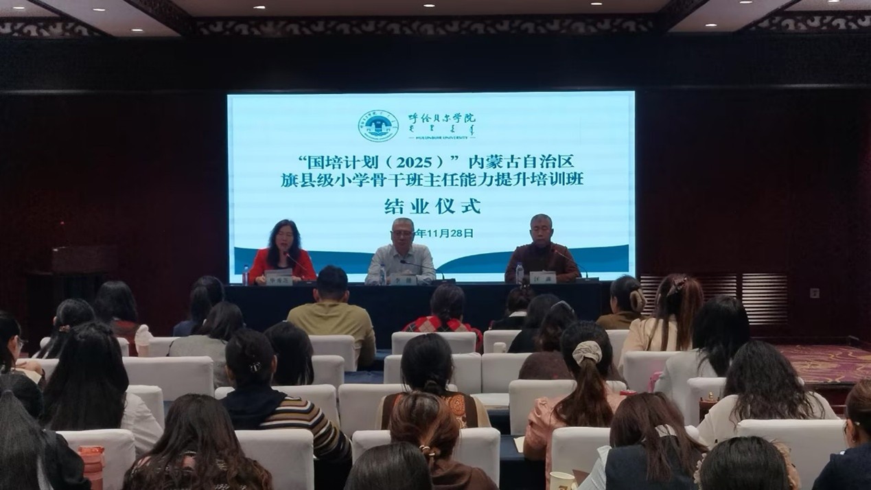 11月28日上午,“国培计划(2025)”内蒙古自治区旗县级小学骨干班主任能力提升培训结业仪式在我校顺利举行。继续教育学院党总支书记李健、副院长汪鑫,海拉尔区教育研修中心副主任毕秀芝及全体参训学员参加结业仪式。仪式由继续教育学院副院长汪鑫主持。